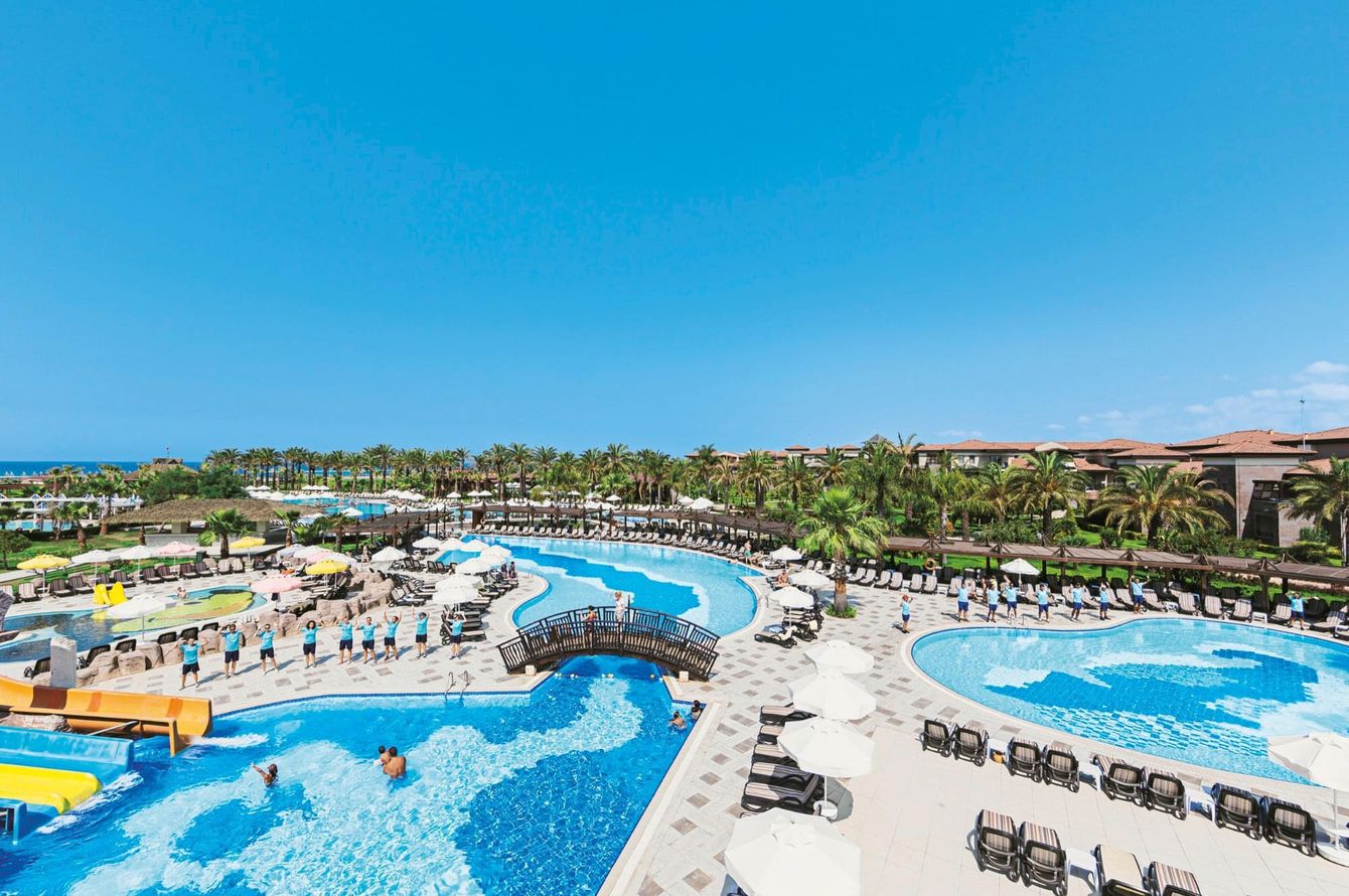 Le complexe hôtelier, avec ses bâtiments à plusieurs étages et bungalows, s’intègre harmonieusement dans les jardins bien entretenus. Hall de réception accueillant avec wifi gratuit. Restaurant-buffet principal, 3 restaurants à la carte (cuisine italienne et turque, poisson et fruits de mer), bar dans le hall, bar de piscine et café. Salon, salle de TV, supérette. Parc bien entretenu avec 2 piscines (dont 1 avec toboggan), terrasse. Parking gratuit selon disponibilité.