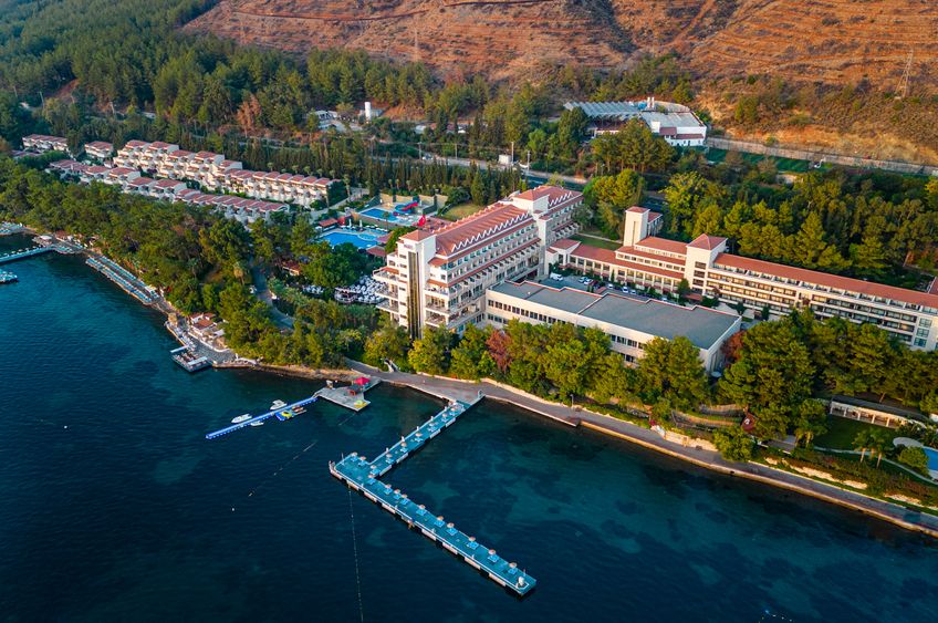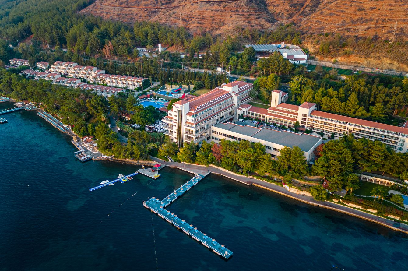 Sur une charmante pente à l'orée d'une forêt de pins, directement sur la baie de Marmaris, à seulement 25 m de la plage de sable fin et de galets qui s'étend sur 650 m. Le centre de Marmaris se trouve à 5 km, tandis que les petits magasins et restaurants se trouvent dans le village pittoresque d'Içmeler, à 3 km. Les environs offrent une multitude de possibilités de loisirs, comme le parc aquatique Atlantis (à 3 km), des baies pittoresques et la ville de Marmaris avec sa marina, sa vieille ville et ses manifestations directement sur la côte. À 95 km de l’aéroport international de Dalaman.